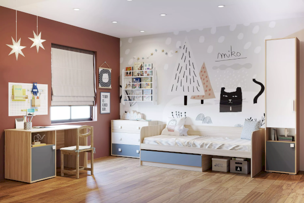 Комод из новой коллекции детской мебели Элиот выполнен в нейтральных оттенках песочного, белого и маренго – цвета темной морской волны, которые отлично подойдут в комнату как девочки, так и мальчика.