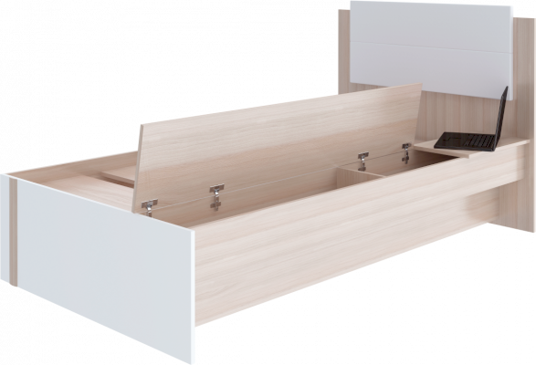 • Кровать оборудована столешницей, состоящей из стационарной части, которую можно использовать как мини-столик, и подъемной панели под которой скрыто место для хранения.
