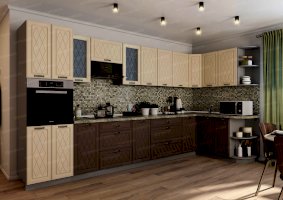 Набор кухонной мебели «Геометрия» получил свое название благодаря оригинальному дизайну. Дело в том, что его фасады украшены незатейливыми симметричными узорами, состоящими из небольших ромбов. Также комплекту присущи симметрия и простота форм. У покупателей есть возможность выбирать цветовое решение: в ассортименте изделия оттенков топаз, тирамису, гранат, алмонд.