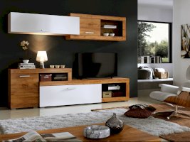 Преимущества: большая ниша для ТВ — для телевизора с диагональю от 50" и больше; стильное исполнение — насыщенный цвет натурального дуба делает мебель максимально привлекательной; настенный модуль — поможет сэкономить драгоценное свободное пространство в комнате, не пренебрегая практичностью. Для изготовления данной модели используется ЛДСП.