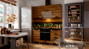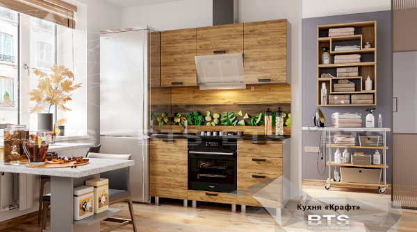Фактурный древесный декор фасадов кухни "Крафт" отсылает к природной естественности и грации, а черные элементы создают яркие акценты, привлекающие к себе внимание. Четкие геометрические линии, массивные ручки под металл и фасады под дерево помогают отступить от стандартных шаблонов оформления кухонного пространства, обустроив у Вас дома воплощение изящества и элегантности!