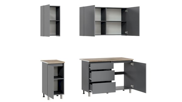 Сборка: нижнего корпуса шириной 1200 мм ящики всегда слева, верхних корпусов и стола 400 мм - универсальная