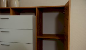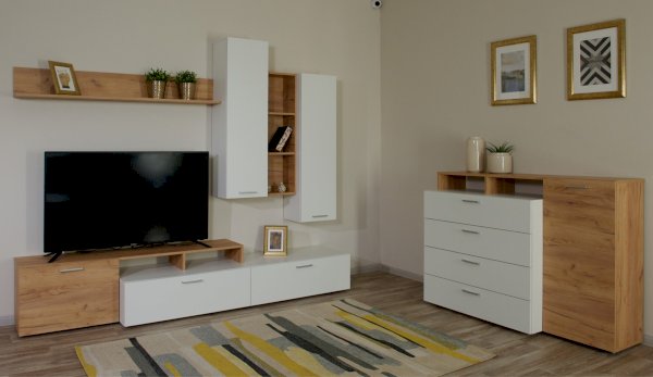 Оригинальный комод Невио – 1 станет незаменимым предметом интерьера в Вашем доме. Яркое сочетание белого цвета с теплым древесным позволит сочетать его с другими предметами мебели и декора, создавать яркие и разнообразные интерьеры. Комод оснащен вместительными ящиками полного выдвижения, открытыми и закрытыми полками. Верхняя крышка комода увеличена на 1 см, что обеспечивает эстетичный вид сверху. Мебель выполнена из высококачественных экологичных материалов