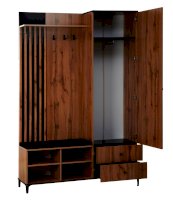 В шкафу есть открытая секция с тремя металлическими крючками, чтобы повесить верхнюю одежду. Ниже предусмотрен мягкий элемент, чтобы можно было присесть и снять обувь или просто поставить сумку. В закрытой секции - выдвижная штанга и шляпная полка. Выдвижная штанга выдерживает вес до 16 кг. Снизу предусмотрены два вместительных выдвижных ящика с шариковыми направляющими. Ящики можно использовать для хранения обуви и обувных аксессуаров.