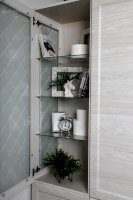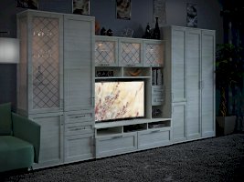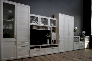 Витрина со стеклянной дверцей и боковиной, за которыми просматриваются полки и выставленные на них предметы. Стекло делает витрину визуально легкой, компактной, а всему помещению добавляет света и торжественности. Шкаф витрину можно использовать не только в сочетании с другими модулями гостиной, но и как отдельный предмет мебели.