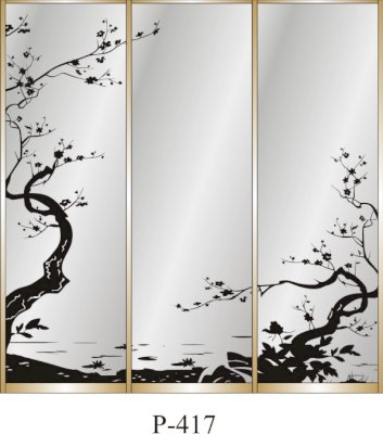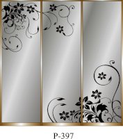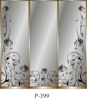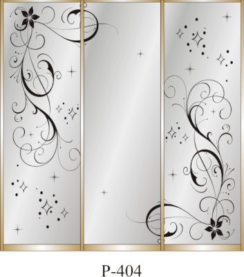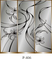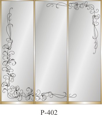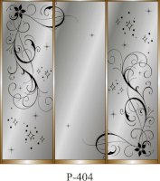Данное изображение представлено в следующих цветах: корпус - Дуб Сонома, фасады - зеркало с пескоструйным рисунком, рамка двери и треки - Серебро матовое.