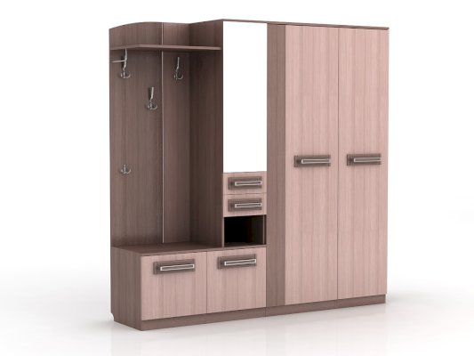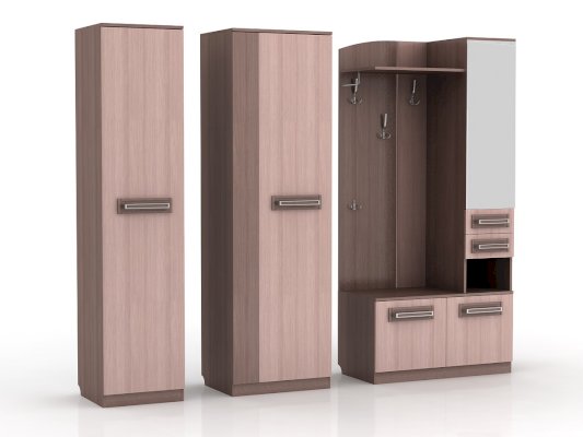 Отличительные особенности прихожей — функциональный дизайн и современные оттенки текстур. Конструкция данной модели включает в себя все необходимое: зеркало, шкаф, пенал, вешалки, ящики и множество полок для различных мелочей.