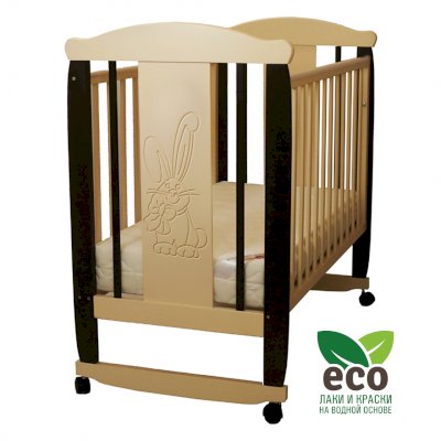 Кроватка декорирована фрезерным рисунком "Заяц с бантом". Уникальные фрезерные рисунки размером от 50 см на обеих спинках.